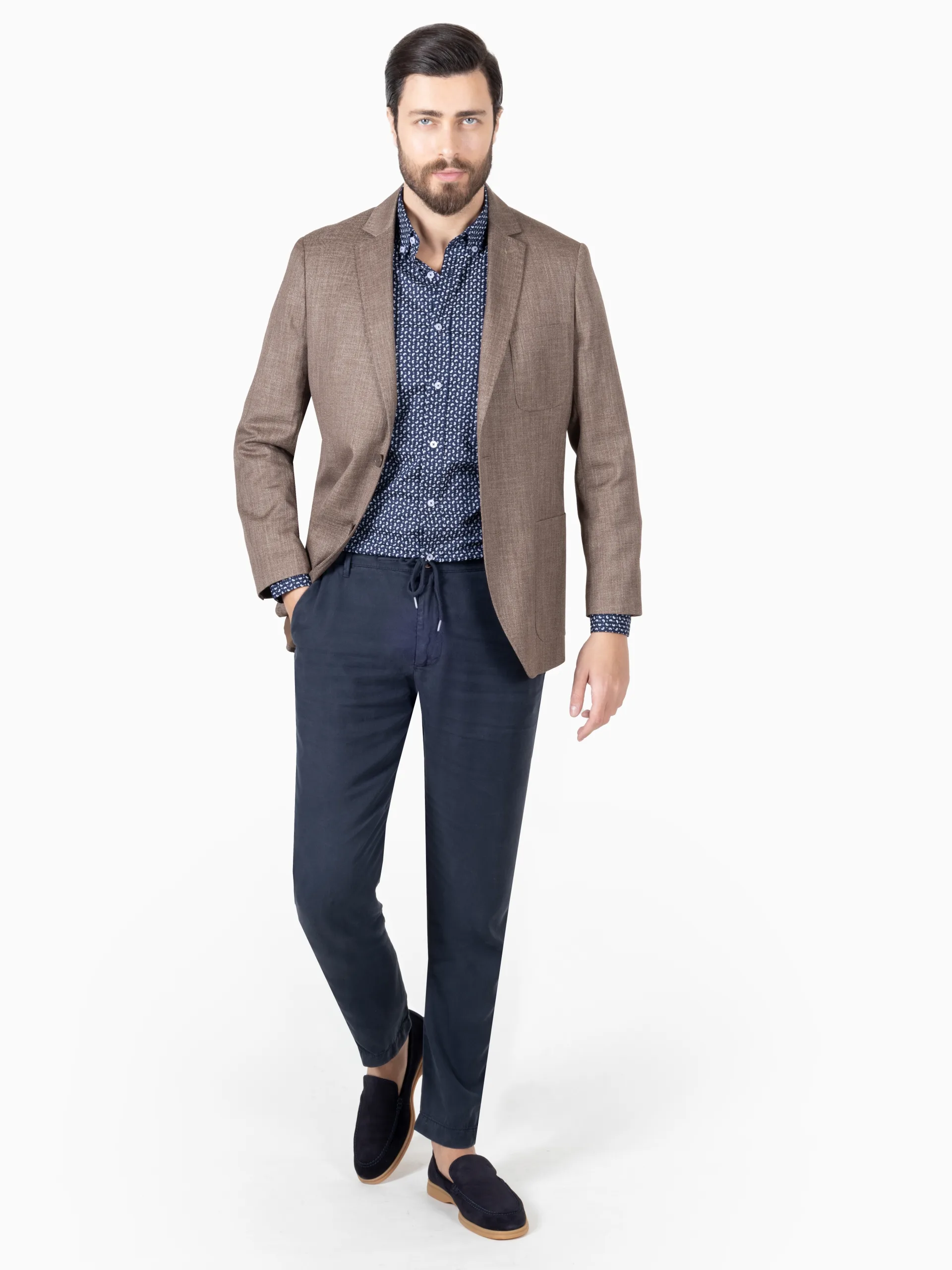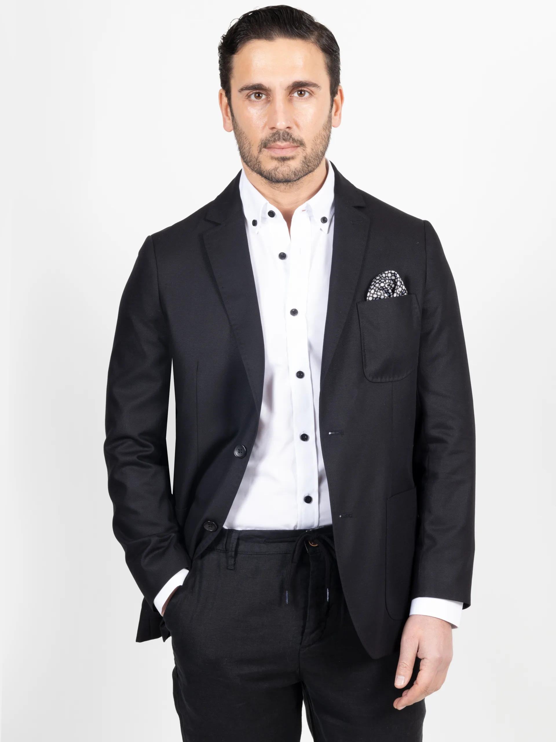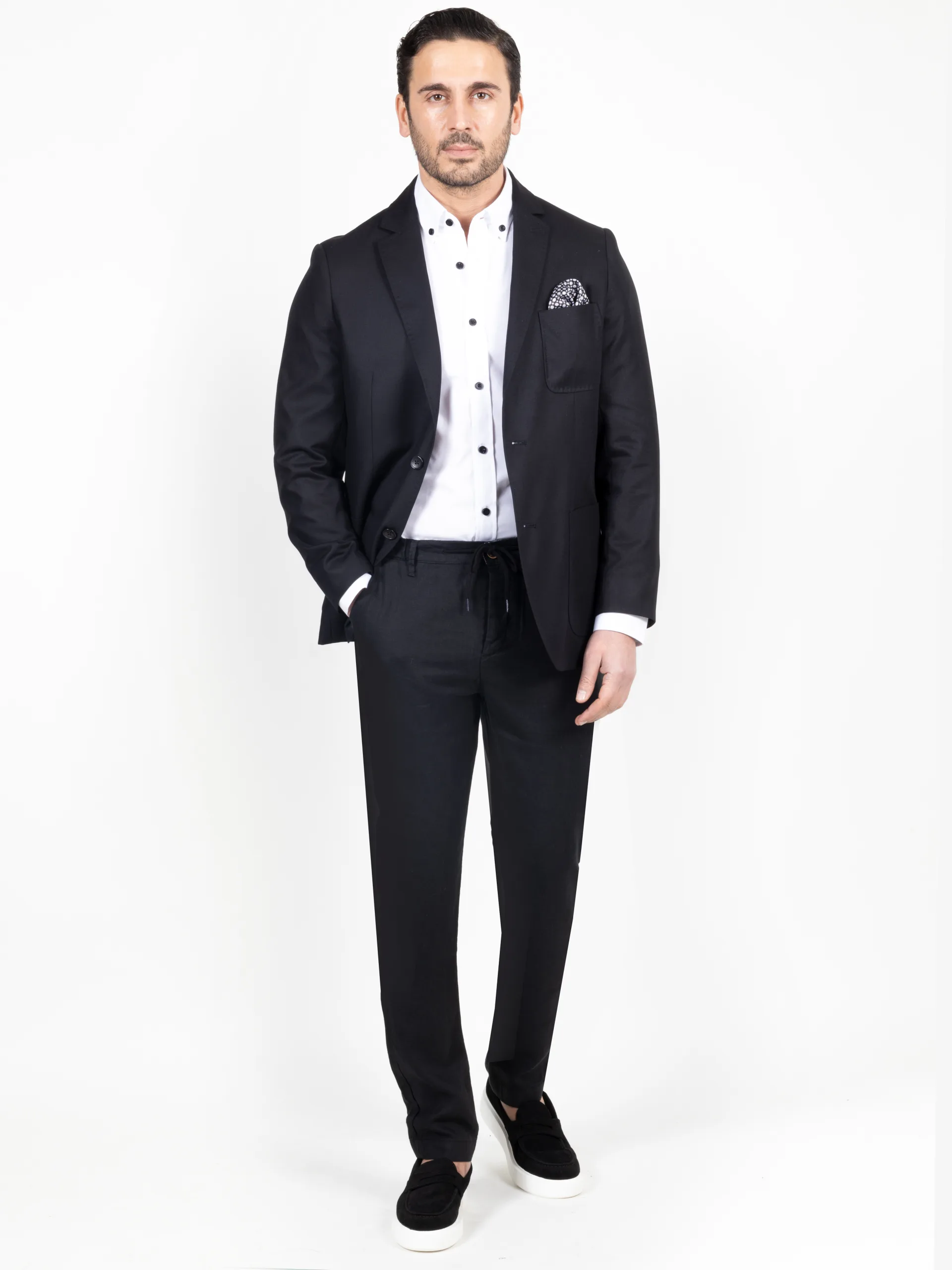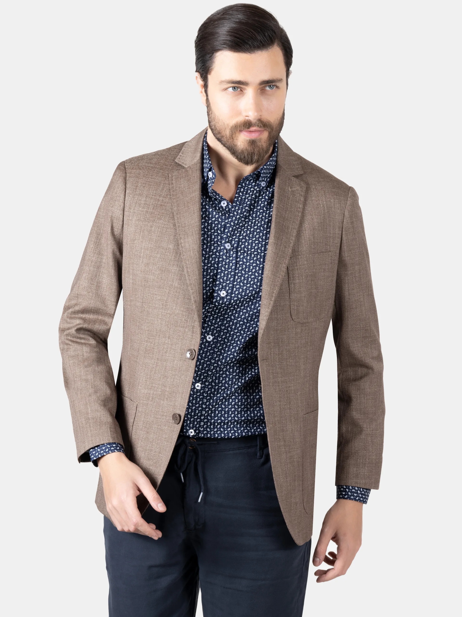 This tailored single-breasted blazer offers a refined, modern silhouette crafted from a smooth, structured fabric that holds its shape beautifully. Designed with sharp lapels, a two-button closure, and clean patch pockets, it delivers effortless sophistication for both formal and smart-casual occasions.