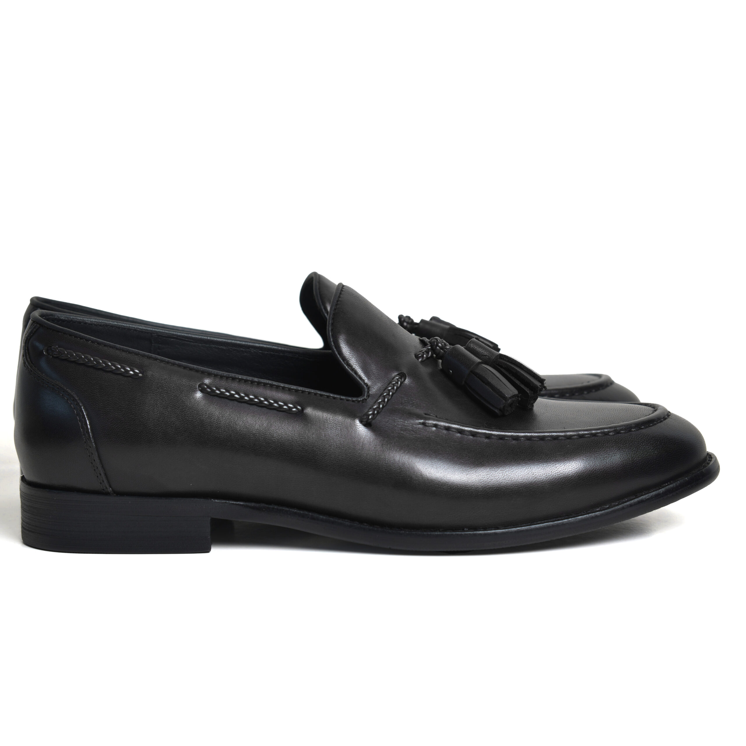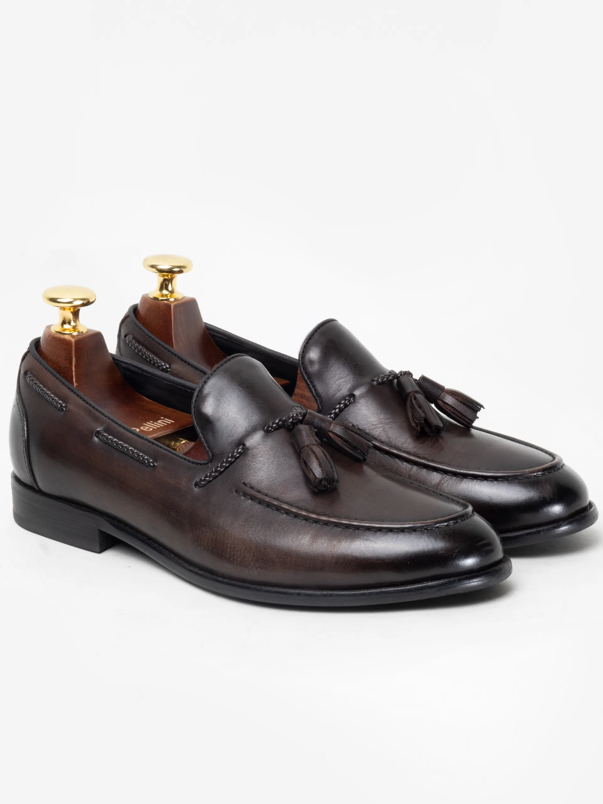 Leather loafers are shaped to a slip-on design with almond toes, featuring brown and black colors.